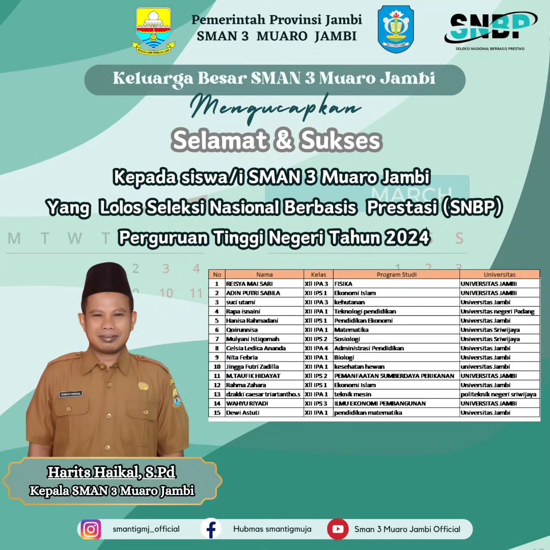 Kelima belas orang siswa/siswi dari Kelas XII SMA Negeri 3 Muaro Jambi yang berhasil lolos SNBP tahun 2024 tersebut. Masing masing yakni, Reisya Maisari, siswi Kelas XII IPA 3, Program Studi Fisika Universitas Jambi (UNJA). Andin Putri Sabila, siswi Kelas XII IPS 1, Program Studi Ekonomi Islam Universitas Jambi (UNJA). Suci Utami, siswi Kelas XII IPA 3, Program Studi Kehutanan Universitas Jambi (UNJA).