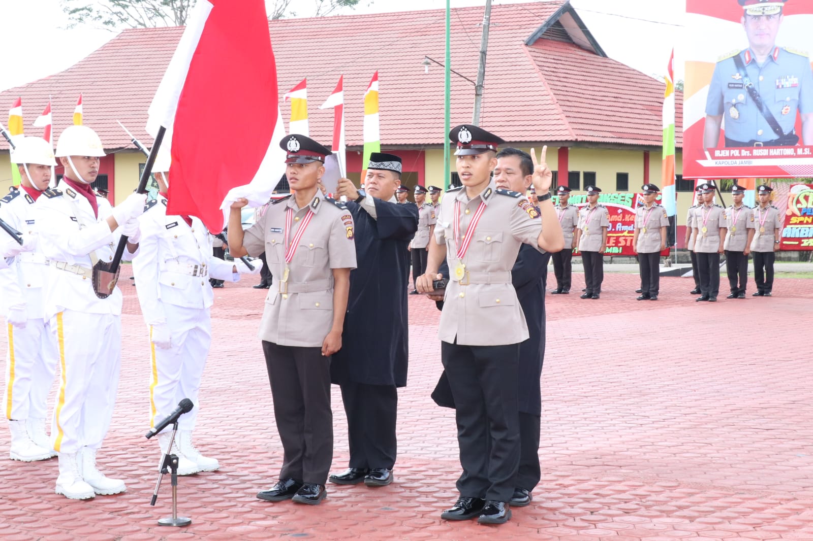 Tampak Hadir dalam upacara, Wakapolda Jambi, Brigjen Pol. Yudawan Roswinarso, Irwasda Polda Jambi Kombes Pol. Raden Heru Prakoso, Kasrem 042/Gapu Kolonel Maskun Nafik, Kepala BPBD Jambi Bachyuni Deliansyah, Para Pejabat utama Polda Jambi, Kapolresta Jambi, Kombes Pol. Eko Wahyudi, Kapolres Muaro Jambi, AKBP Yuyan Priatmaja, Wadandenpom II/2 Jambi Mayor CPM Hari Sulistyono, Danki Batalyon 142/KJ Kapten Nurmansyah dan orang tua para siswa yang dilantik. (*)