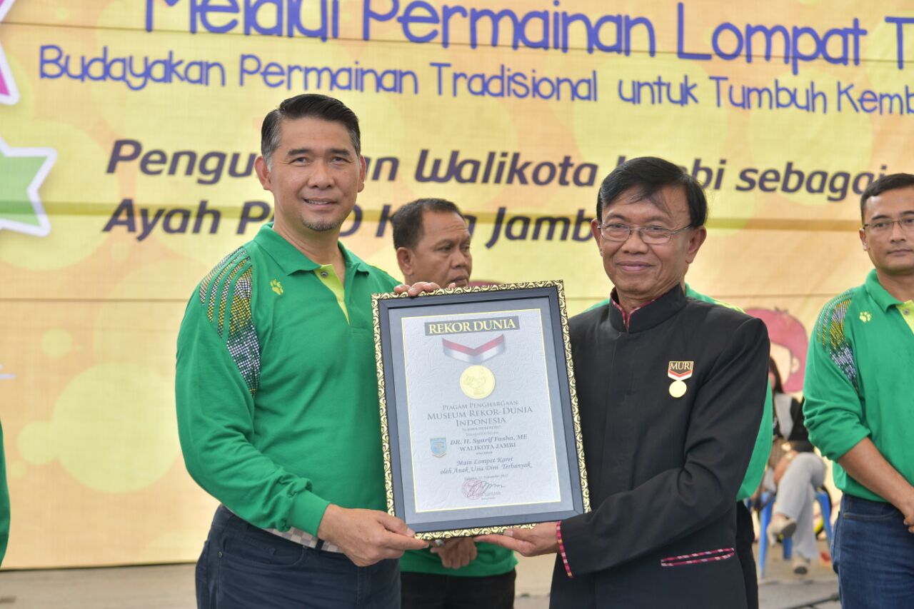 “Hari ini bersama kita saksikan peristiwa penting bersejarah di Kota Jambi, tercatat lebih dari empat ribu lebih anak-anak PAUD di Kota Jambi, secara bersama-sama telah memecahkan rekor dunia untuk permainan tradisional lompat karet terbanyak di Indonesia bahkan dunia,” ujar Yusuf.