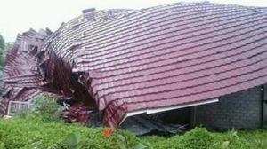 Atap gedung Empat Jenis yang melekat dirangka baja, rubuh dihantam dahsyatnya angin yang melanda desa Betung Mudik, di pagibuta sekitar pukul 05.00 WIB.