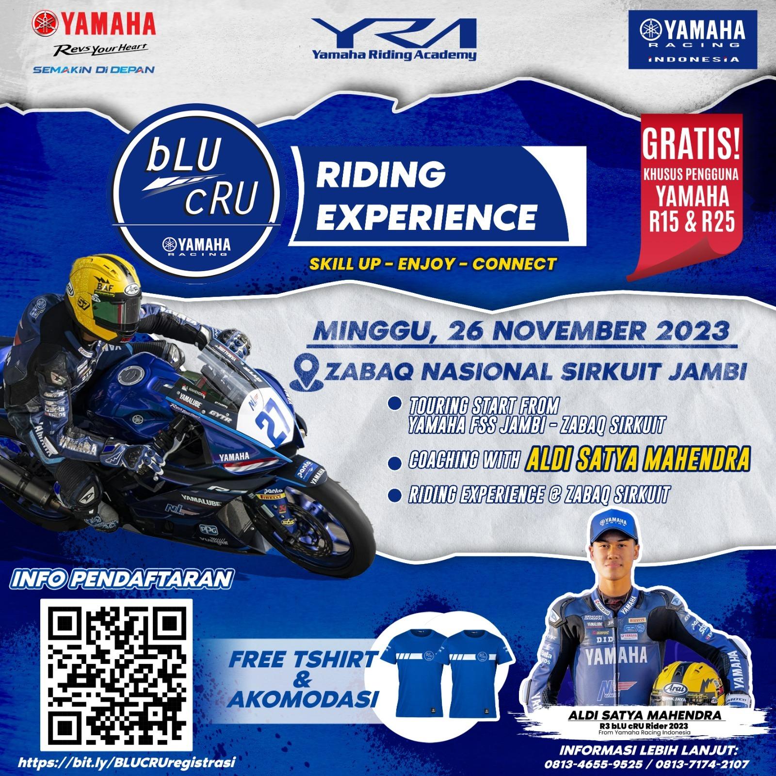 Jambi (WARTANEWS.CO) – Khusus untuk pengguna Yamaha R15 dan R25 di Jambi bisa mengikuti event terakbar di penghujung tahun 2023 ini yaitu Blu Cru Riding Experience yang bakal di adakan di hari minggu 26 November 2023 ini.