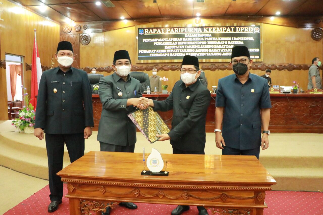 Rapat paripurna diawali dengan penyampaian laporan hasil kerja Panitia Khusus (Pansus) I DPRD yang disampaikan oleh juru bicara Pansus Sutejo serta dilanjutkan dengan penyampaian laporan hasil kerja Pansus II DPRD disampaikan oleh juru bicara Muhammad Zaki, ST. Kegiatan dilanjutkan dengan penandatanganan berita acara persetujuan bersama antara pemerintah Kabupaten Tanjung Jabung Barat dan DPRD.