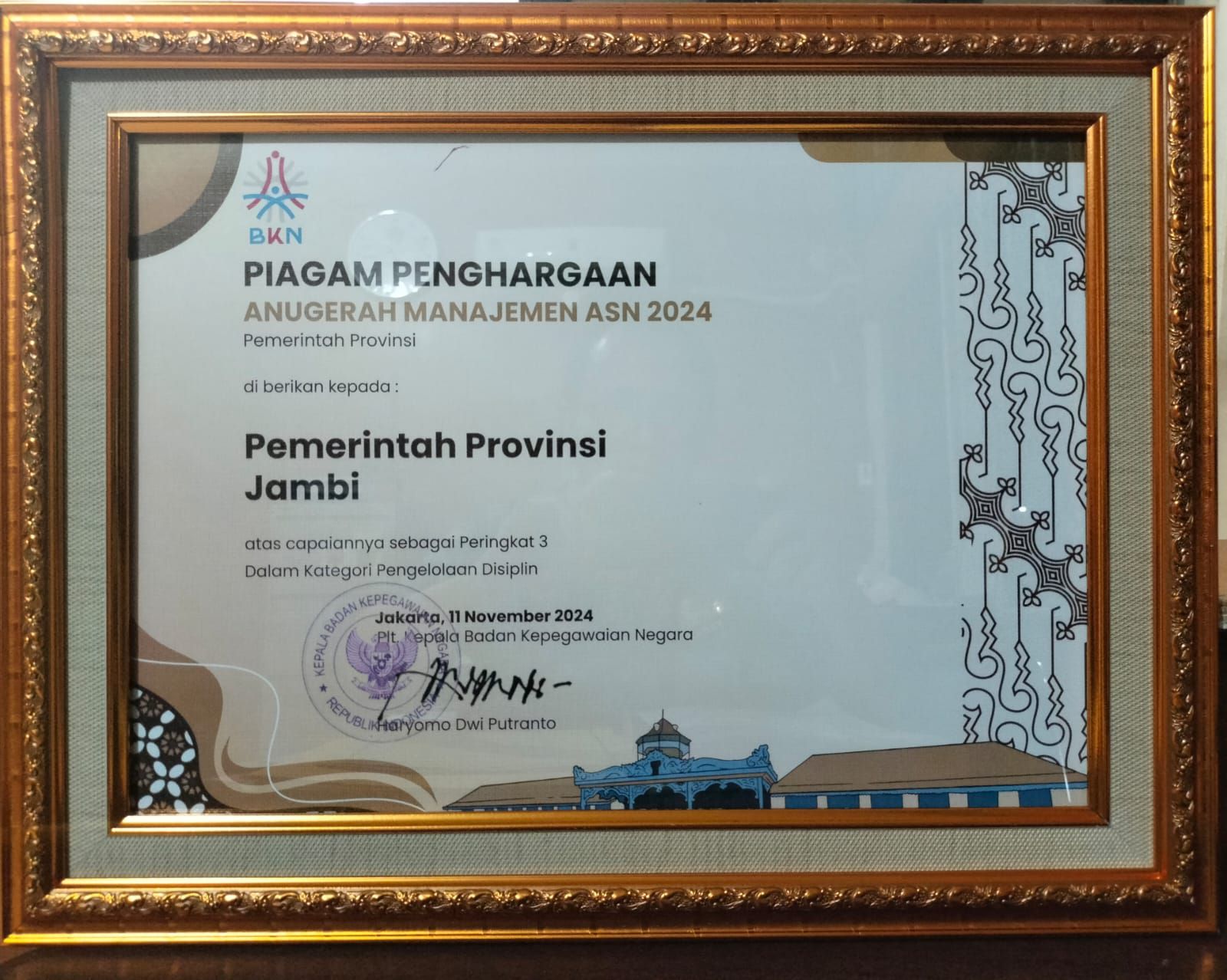 Provinsi Jambi Raih 2 Penghargaan Peringkat 3 Nasional Anugerah Manajemen ASN 2024