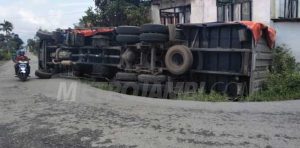 Mobil Fuso Bawa Air Mineral Dari Palembang Terbalik