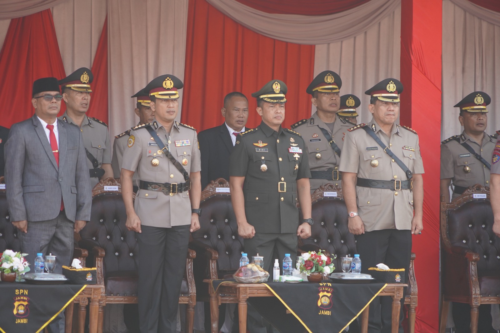 Hadir juga pada Upacara tersebut Kasipers Kasrem 042/Gapu Kolonel Kav Didi Carsidi, S.Sos., M.I.Pol. Para Pejabat Utama Polda Jambi, Wakil Ketua I DPRD Kab. Muaro Jambi Junaidi, S.E, Danyonif R 142/KJ Dandenpom II/2 serta para undangan lainya. (*)