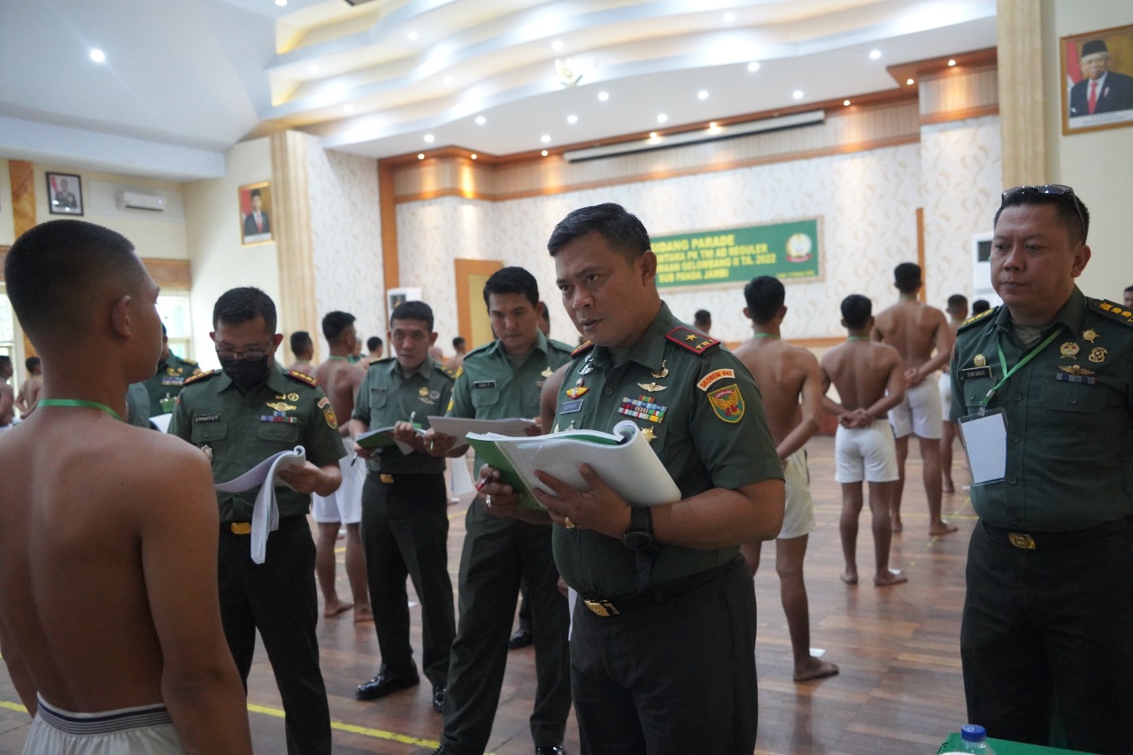 JAMBI (WARTANEWS.CO) – Komandan Korem 042/Gapu Brigjen TNI Supriono,S.IP., M.M memimpin langsung Sidang Parade Calon Tamtama (Cata) Prajurit Karier (PK) TNI AD Reguler dan Keagamaan Gelombang II TA 2022 Sub Panda Jambi Korem, bertempat di Balai Prajuruit Korem 042/Gapu, Jalan Jenderal Urip Sumoharjo, Kel Sungai Putri, Kecamatan Danau Sipin, Kota Jambi, Kamis (13/10/2022).