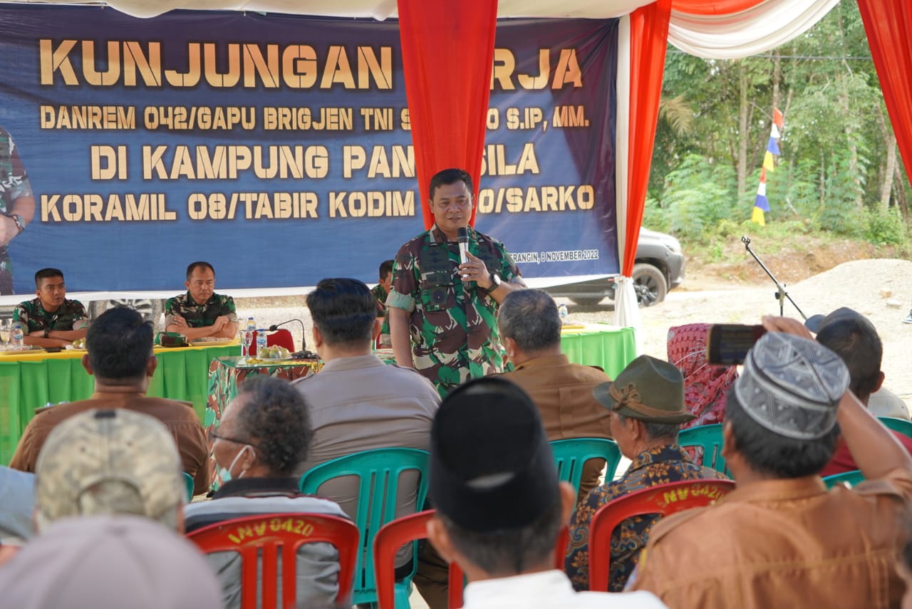 JAMBI (WARTANEWS.CO) – Komandan Korem 042/Gapu Brigjen TNI Supriono, S.IP., M.M mengunjungi Kampung Pancasila binaan Kodim 0420/Sarko, yang bertempat di Dusun Mekar Jaya, Desa Muara Jernih, Kec. Tabir Ulu, Kab. Merangin, Selasa (8/11/2022).