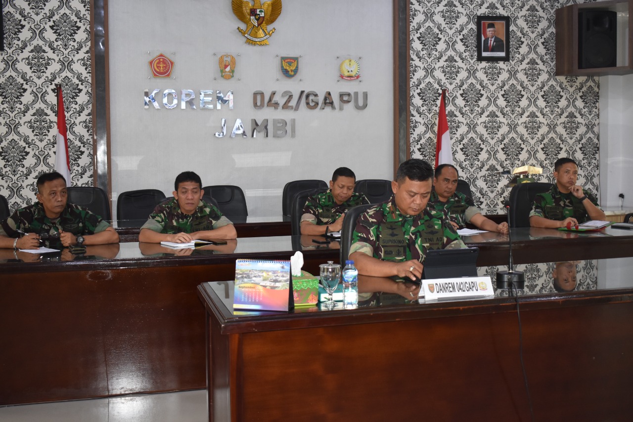 Jambi (WARTANEWS.CO) – Komandan Korem 042/Gapu Brigjen TNI Supriono, S.IP., M.M, mengikuti pengarahan Pangdam II/Sriwijaya Mayjen TNI Hilman Hadi, S.I.P.,M.B.A., M.Han, melalui Video Conference bertempat di ruang rapat lantai dua Makorem 042/Gapu. Jalan Jend Urip Sumoharjo Kel. Sungai Putri Kec. Danau Sipin Kota Jambi, Selasa (25/10/2022).