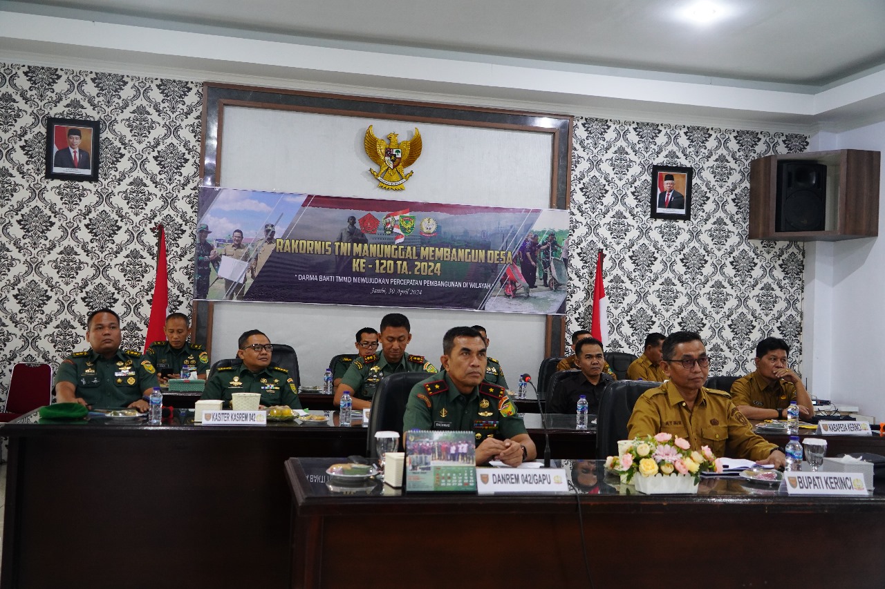 Jambi (WARTANEWS.CO) – Danrem 042/Garuda Putih Brigjen TNI Rachmad S.I.P mengikuti Video Conference (Vicon) Rakornis TMMD ke-120 TA. 2024, yang rencananya akan dilaksanakan serentak di 50 wilayah Kabupaten/Kota termasuk kabupaten Kerinci Provinsi Jambi bertempat di Ruang Rapat Makorem 042/Garuda Putih Jl. Urip Sumoharjo Kota Jambi, Selasa (30/04/2024).
