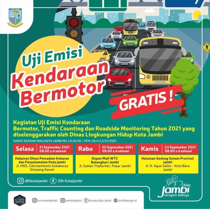 Di kesempatan itu, Kepala Dinas Lingkungan Hidup, Ardi menerangkan bahwa kegiatan uji emisi di lakukan selama 3 hari di tiga tempat yakni Markas Komando Dinas pemadam kebakaran Kota Jambi, di Jalan Sultan Taha depan WTC, dan di Jalan Agus Salim di depan sanggar senam Kota Baru.