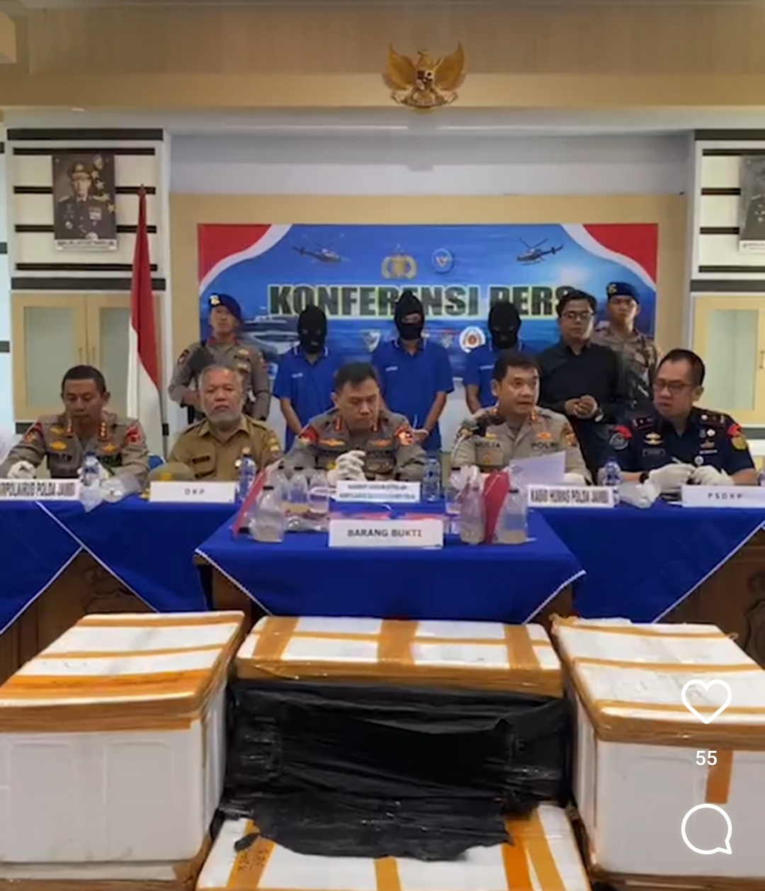 Konferensi pers dibuka oleh Kabid Humas Polda Jambi Kombes Pol Mulia Prianto. Tampak hadir Dirpolairud Polda Jambi Kombes Pol Agus Tri Waluyo, Direktur Jenderal Pengawasan Sumber Daya Kelautan dan Perikanan (PSDKP) diwakili oleh Direktur Pengawasan Sumber Daya Perikanan Dr Drama Panca Putra, Kepala Pangkalan PSDKP Batam diwakili Katimja Pengawasan SDP Turman Hardianto Maha, Kepala Balai Pengelolan Sumber Daya Pesisir dan Laut (BPSPL) Padang diwakili oleh Koordinator Wilker BPSPL Jambi Eri Doni, Kepala Badan Pengendalian dan Pengawasan Mutu Hasil Kelauatan Dan Perikanan (BP2MKHP) Piyan Gustaffiana serta Kepala Dinas Kelautan dan Perikanan (DKP) Provinsi Hernowo. (Lan)