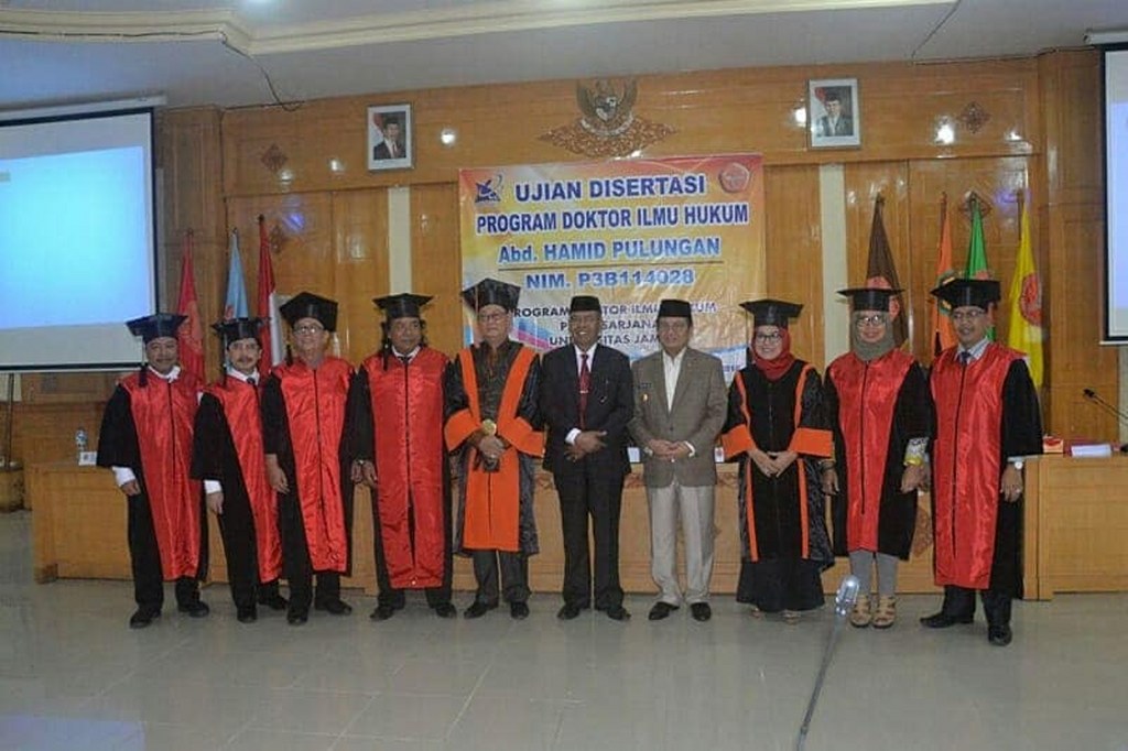 Tim penguji disertasi diketuai oleh Rektor Unja, Prof. Johni Najwan, SH,MH,Ph.D, Sekretaris Prof.Dr.Ir.Hj. Anis Tatik Maryani,MP, Penguji Utama, Prof.Dr. Drs. Abd. Somad, SH, MH, Penguji, Prof. Dr. M. Hadi Subhan, SH, MH, CN, Penguji, Prof.Dr.Elita Rahmi,SH,MH. Penguji, Dr.H.Usman,SH,MH Penguji, Dr.Helmi, SH,MH, Penguji, Prof.Dr.Sukamto Satoto,SH,MH, Promotor, Prof.Dr.Bahder Johan Nasution,SH,M.Hum Co-Promotor.