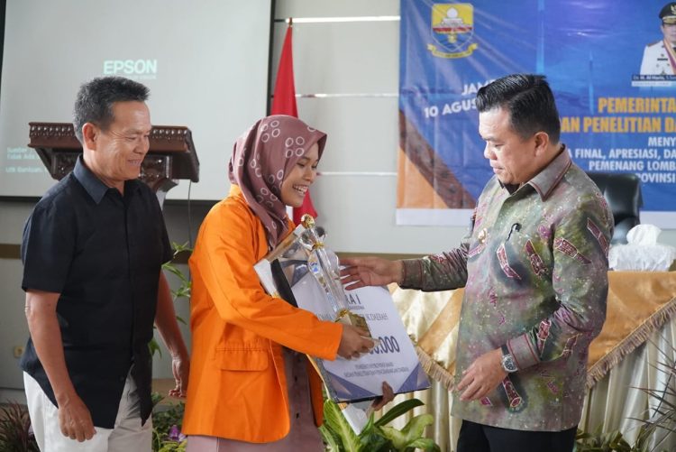 Pada kesempatan ini Gubernur Al Haris juga menyerahkan penghargaan berupa piala dan piagam serta uang pembinaan kepada mahasiswa dan pelajar yang meraih kemenangan pada Lomba Inovasi Produk Daerah Provinsi Jambi Tahun 2023.