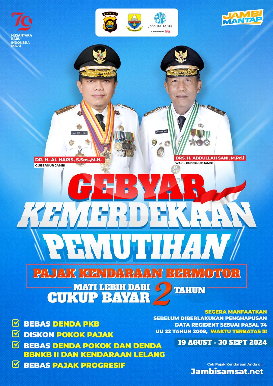 JAMBI (WARTANEWS.CO) – Gubernur Jambi Al Haris lewat Pemerintah Provinsi (Pemrov) Jambi, mengadakan pemutihan pajak kendaraan dalam rangka memperingati Hari Ulang Tahun Republik Indonesia (HUT RI) ke-79.