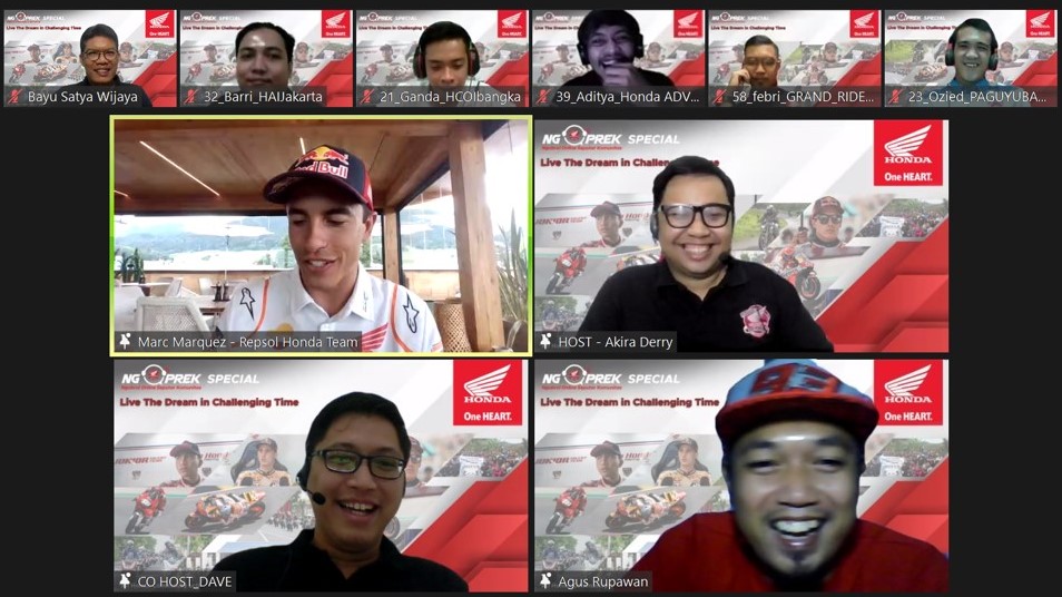 Jakarta (WARTANEWS.CO) – Pebalap dunia MotoGP, Marc Marquez, memberikan kejutan bagi para bikers Honda di Tanah Air melalui kehadirannya pada acara silahturahmi virtual Ngobrol Online Seputar Komunitas atau NGOPREK. Dalam acara yang diinisiasi PT Astra Honda Motor (AHM), pebalap dari Repsol Honda Team ini mengajak komunitas Honda untuk tetap semangat mewujudkan mimpi dan terus memberikan kontribusi yang baik untuk orang banyak dalam kondisi yang penuh tantangan saat ini.
