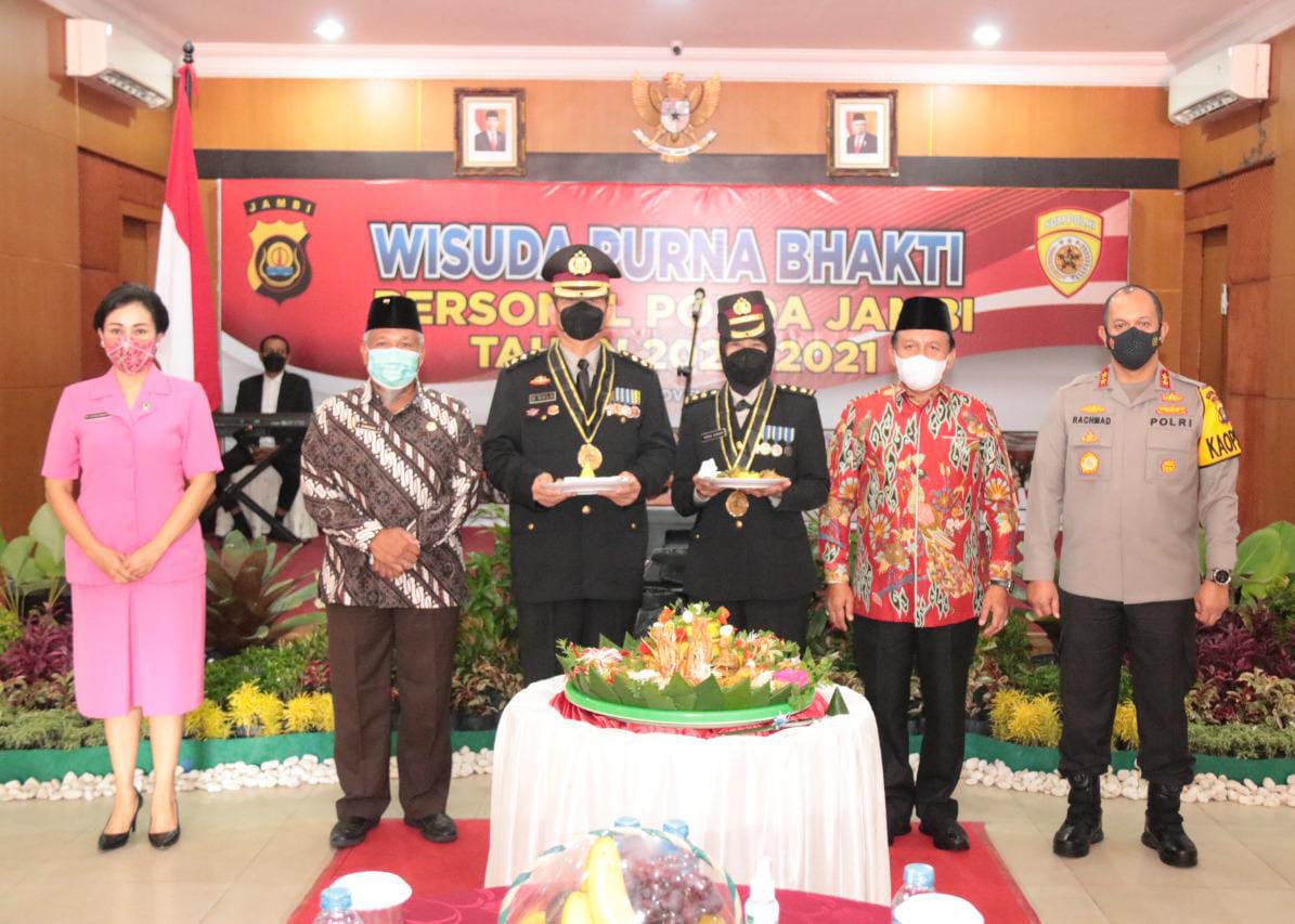 Jambi (WARTANEWS.CO) – Kapolda Jambi Irjen Pol A Rachmad Wibowo, SIK didampingi Ibu Ketua Bhayangkari Daerah Jambi Ny Evi Rachmad Wibowo menghadiri Kegiatan Wisuda Purna Bakti Personel Polda Jambi tahun 2020-2021 di Balai Bhayangkara Siginjai Polda Jambi, Kamis (25/11/21).