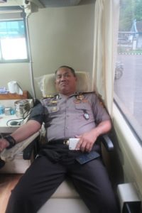 Direktur Pengaman Objek Vital (Pam Obvit) Polda Jambi Kombes Burhanuddin saat menjalani prosesi pengambilan darah. “Darah menjadi lebih encer apabila sering melakukan donor darah ”, ujar orang nomor satu di Direktorat Pengamanan Objek Vital Polda Jambi tersebut.
