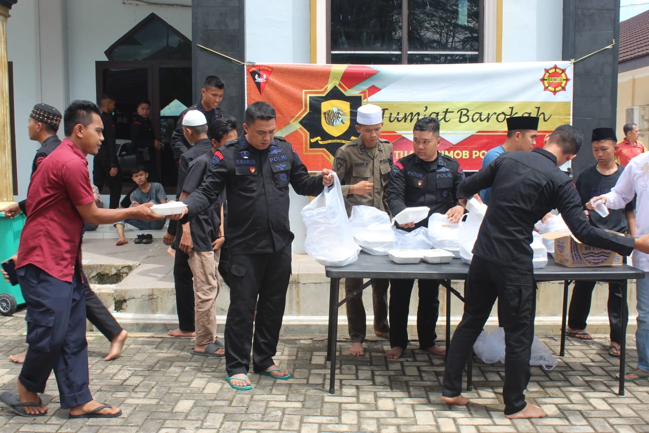 Kegiatan dilanjutkan dengan sholat Jum’at bersama ratusan personel bersama masyarakat di Masjid Ar Rahman Makosat Brimob Polda Jambi. Usai sholat, para personel membagikan makanan dan mengajak masyarakat untuk makan siang bersama dengan Dansat Brimob Polda Jambi, Kombes Pol, Nadi Chaidar, SIK.