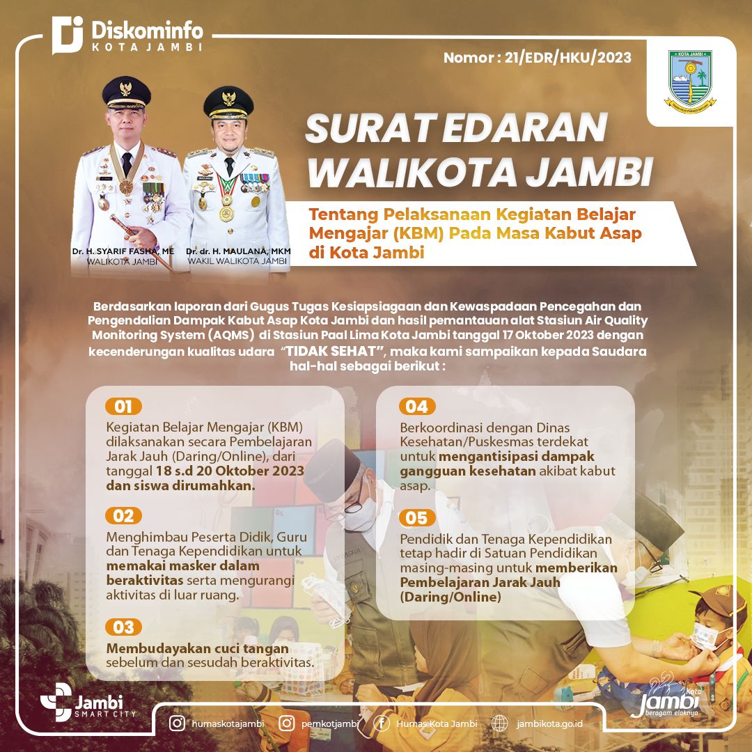 Kebijakan tersebut tertuang dalam Edaran Wali Kota Jambi nomor 21/EDR/HKU/2023 tanggal 17 Oktober 2023 tentang Pelaksanaan Kegiatan Belajar Mengajar (KBM) pada Masa Kabut Asap di Kota Jambi.