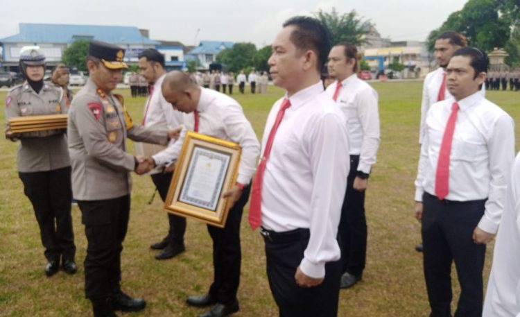 Pemberian penghargaan dilakukan di lapangan Mapolresta Jambi Senin (16/1/2024) pagi. Tampak hadir Irwasda Polda Jambi Kombes Pol Jannus, Kapolresta Jambi Kombes Pol Eko Wahyudi, Dirlantas Kombes Pol Dhafi, Kabid Propam Kombes Pol ADG Sinaga, Dirresnarkoba AKBP Ernesto Seiser dan Wakapolresta Jambi AKBP Rully.