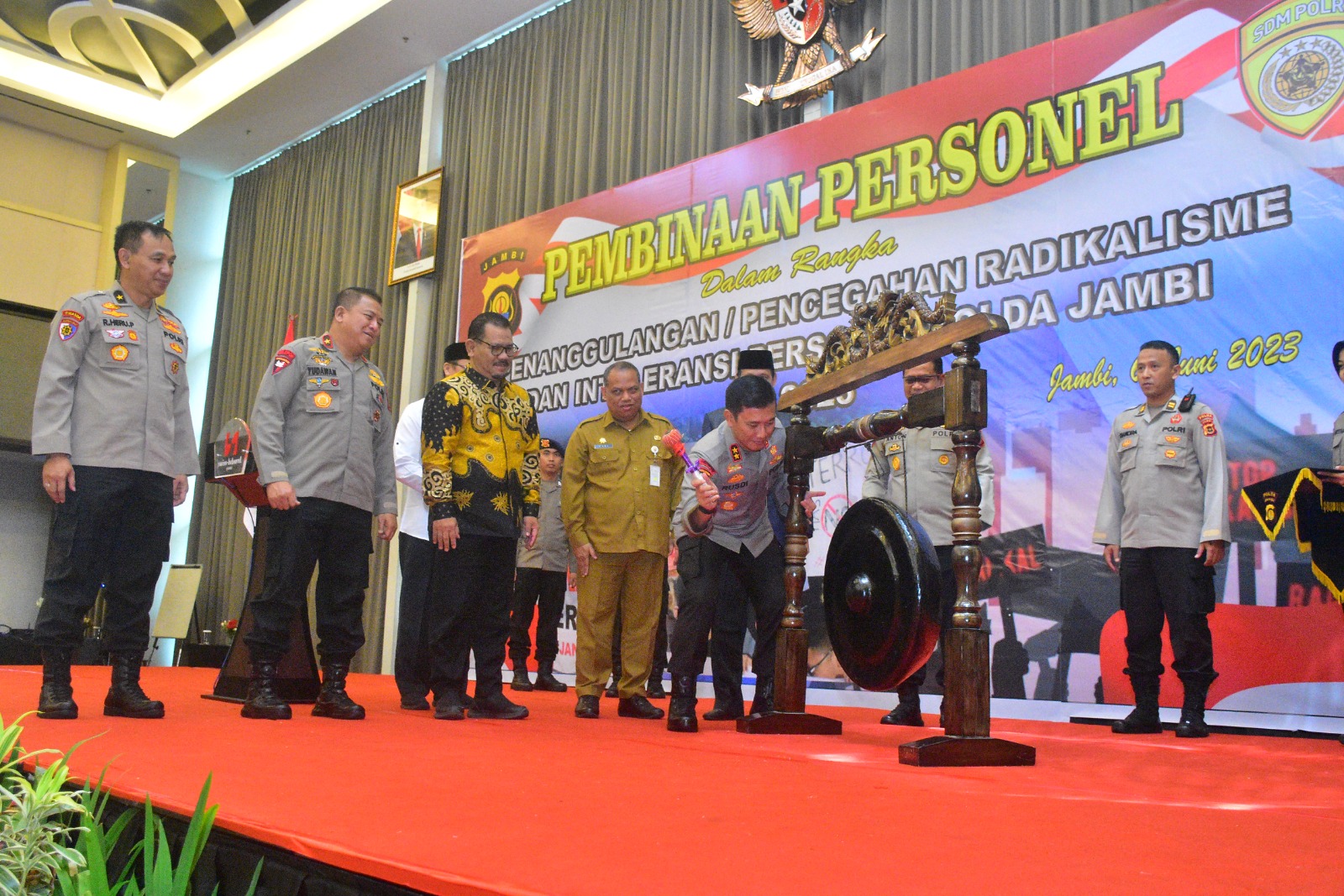 Kegiatan diakhiri dengan pemukulan gong oleh Kapolda Jambi didampingi oleh PJU Polda Jambi dan narasumber, sebagai tanda dibukanya kegiatan pembinaan personel guna penanggulangan / pencegahan radikalisme dan intoleransi personil Polda Jambi. (*)