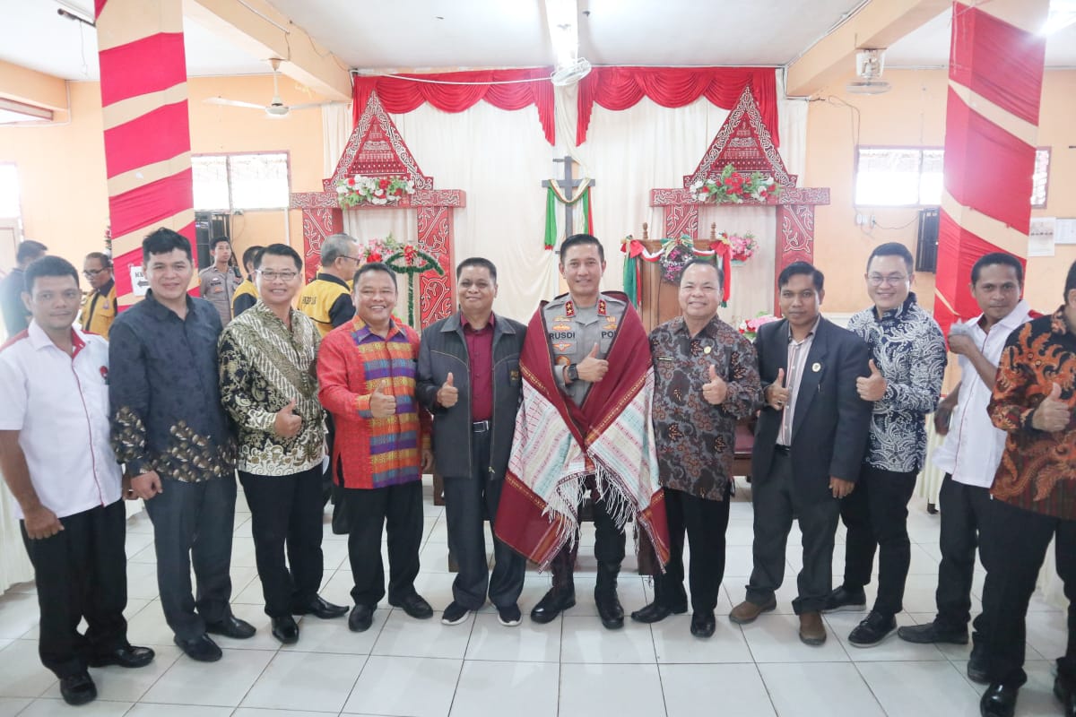 Setibanya di Gereja HKBP, Kapolda Jambi disambut para Tokoh Agama Kristen Protestan dan para Pendeta Gereja.