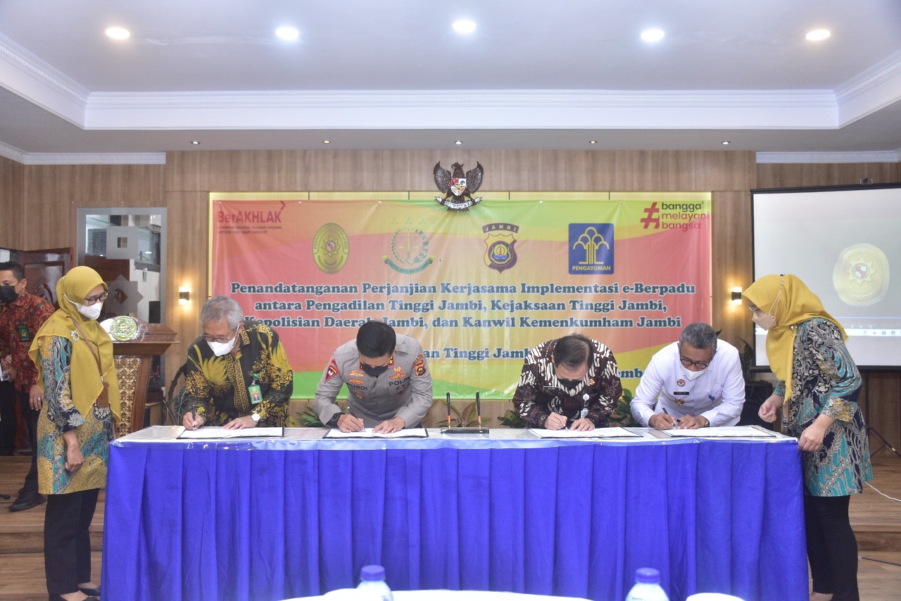 Jambi (WARTANEWS.CO) – Kapolda Jambi Irjen Pol. Rusdi Hartono melakukan Penandatanganan Perjanjian Kerjasama Implementasi e-Berpadu antara Ketua Pengadilan Tinggi Jambi dengan aparat penegak hukum di wilayah Jambi.