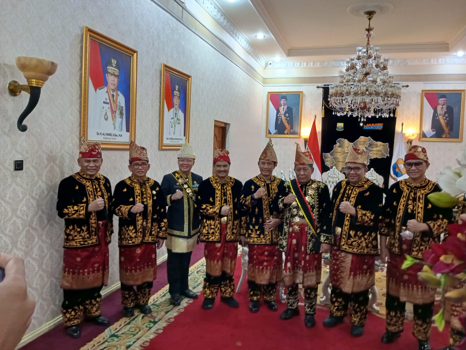 Kabid Humas Polda Jambi, Kombes Pol Mulia Prianto melalui Paur Penum Subbid Penmas Bidhumas Polda Jambi, Ipda Alamsyah Amir menyampaikan Acara Prosesi Penganugerahan Gelar Adat Melayu Jambi tadi berlangsung di Rumah Dinas Gubernur yang mana mengikuti Prosesi Kato Bejawab Penjemputan menggunakan Baju Adat Melayu Jambi.
