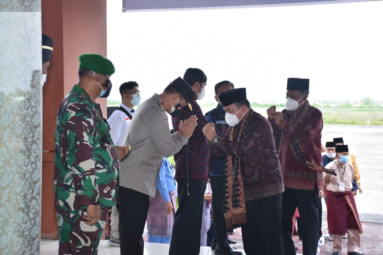 Kedatangan Gubernur dan Wakil Gubernur Jambi ini tetap disambut tradisi tarian sekapur sirih dan tabur beras kunyit, namun tetap berpedoman pada protokol kesehatan.