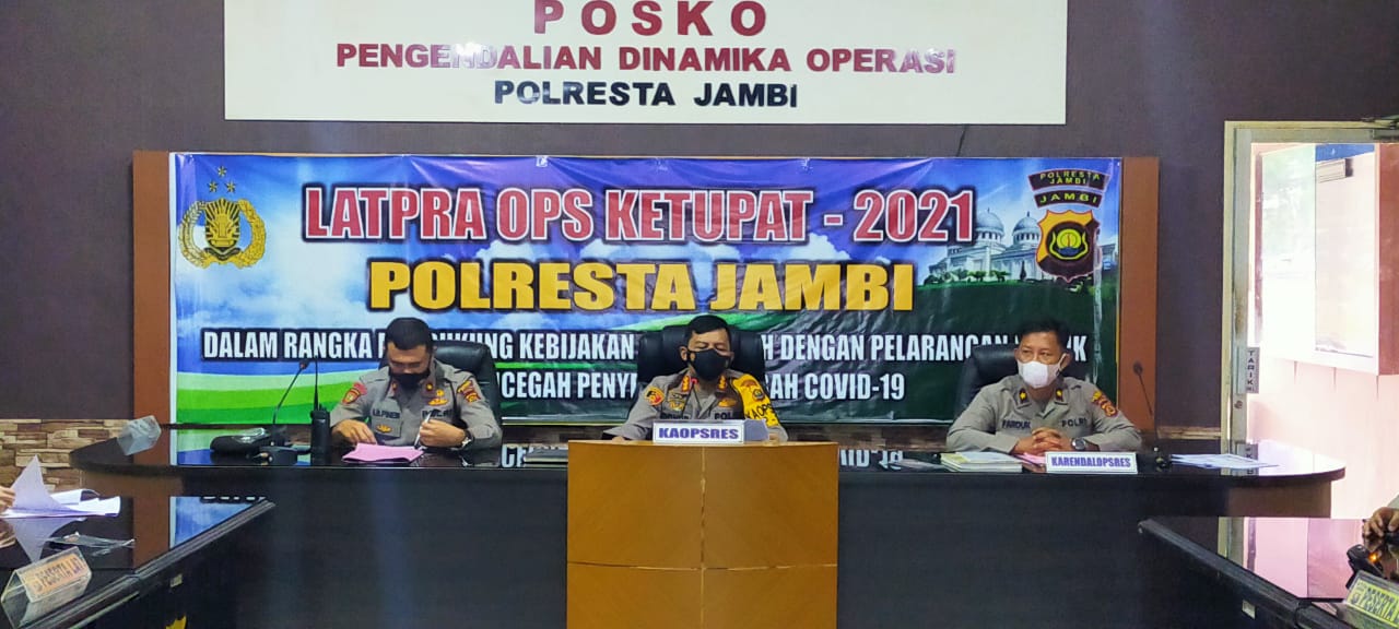 Jambi (WARTANEWS.CO) – Kapolresta Jambi Kombes Pol. Dover Christian, S.I.K., M.H. Memimpin kegiatan LATPRA OPS KETUPAT 2021 Dalam rangka mendukung kebijakan Pemerintah dengan pelarangan mudik guna mencegah penyebaran virus Covid-19, bertempat diruang Data Bagops Polresta Jambi. Kamis (29/4) pagi.