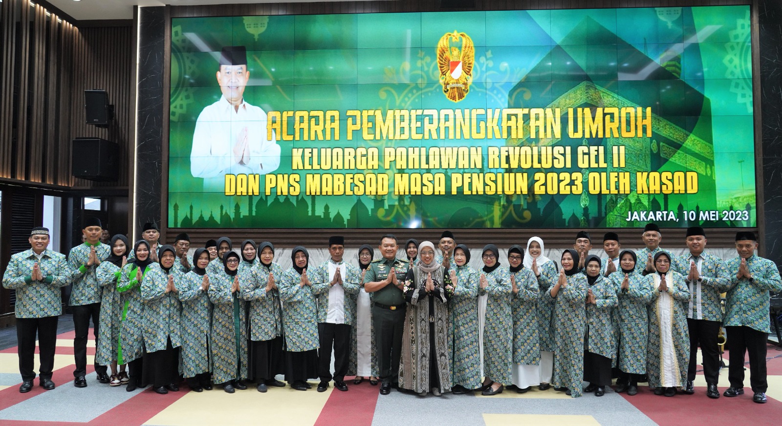 JAKARTA (WARTANEWS.CO) – Kepala Staf Angkatan Darat (Kasad) Jenderal TNI Dr. Dudung Abdurachman didampingi Ketua Umum Persit Kartika Chandra Kirana, Ny. Rahma Dudung Abdurachman memberangkatkan 34 orang untuk menunaikan ibadah umroh. Rombongan yang akan segera bertolak ke Mekkah, Arab Saudi, tersebut terdiri dari empat putra-putri kandung dari Pahlawan Revolusi, 25 PNS Markas Besar Angkatan Darat (Mabesad) yang tahun ini akan memasuki masa purna tugas, serta lima orang pendamping. Acara pemberangkatan umroh digelar di Aula GPH Djatikusumo, Mabesad, Jakarta, Rabu (10/05/2023).