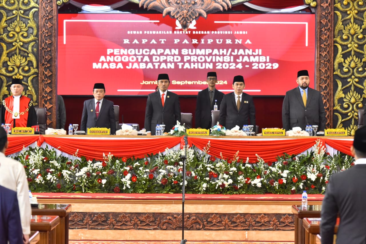 Sebanyak 55 anggota DPRD Provinsi Jambi terpilih periode 2024-2029 resmi dilantik dan diambil sumpah/janji jabatan dipimpin oleh Ketua Pengadilan Tinggi Jambi Dr. Herdi Agusten, S.H., M.Hum.
