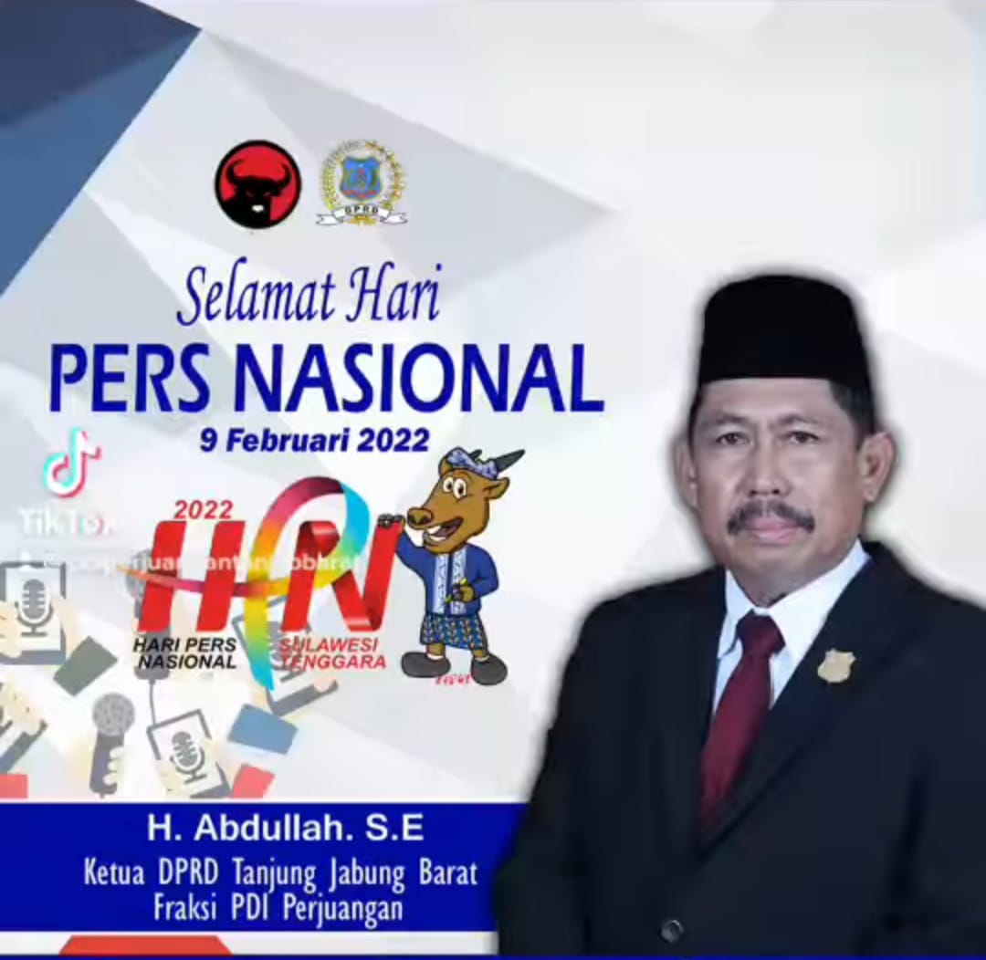 Politisi Partai Demokrasi Indonesia Perjuangan (PDIP) yang juga menjabat sebagai Ketua DPRD Tanjung Jabung Barat, H Abdullah, SE menyampaikan ucapan selamat Hari Pers Nasional (HPN) yang ke-76 tahun 2022 melalui akun Facebook pribadinya.