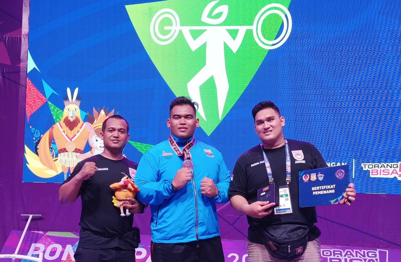 Sedangkan untuk medali perunggu, diraih oleh lifter Papua, Zakeus Wakum, dengan total angkatan 900kg dari babak squat 410kg, bench press 220kg, dan dead lift 270kg.