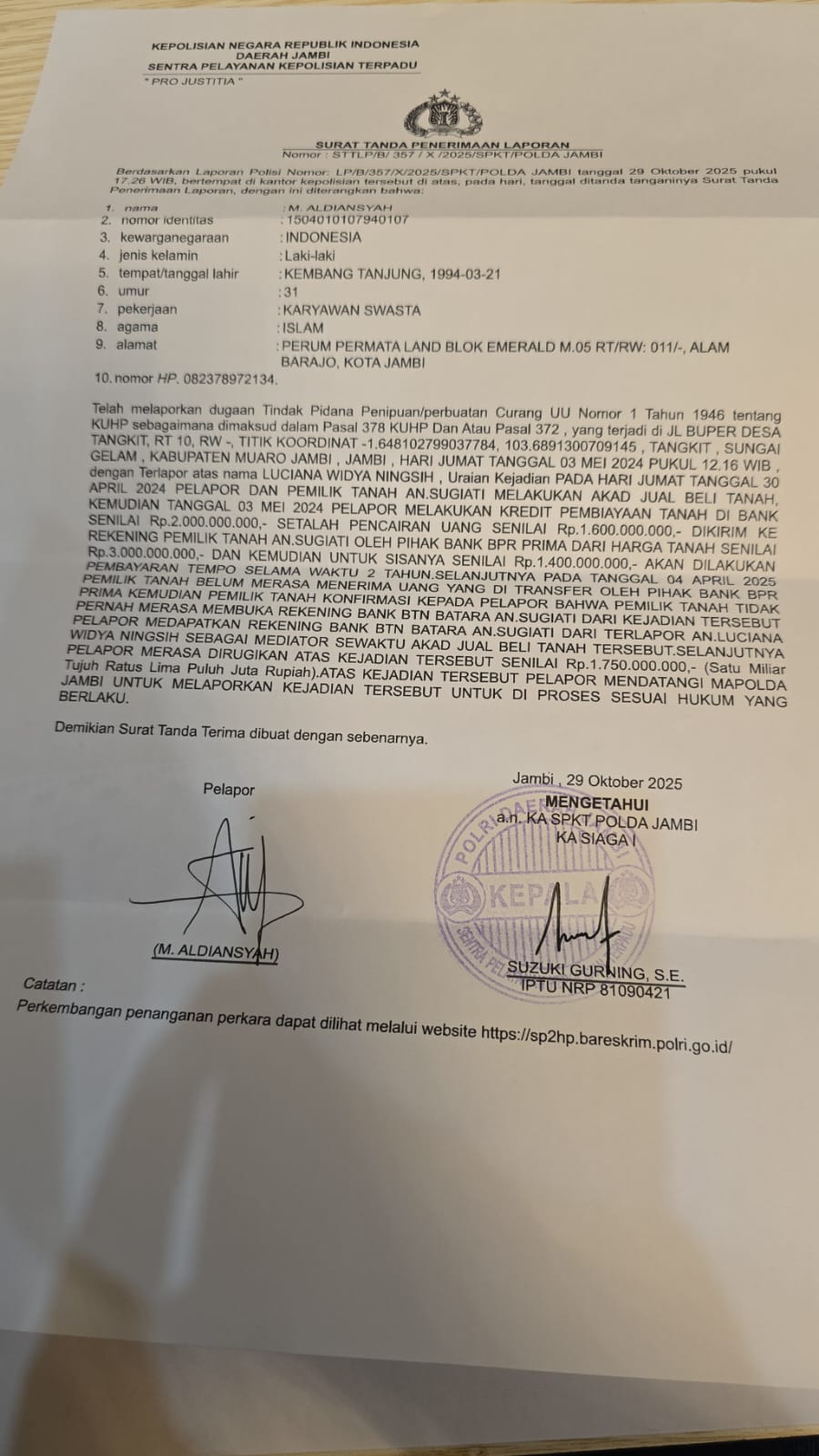 Dikonfirmasi via telpon, Aldi mengakui adanya laporan resmi yang disampaikannya ke Polda Jambi terkait dugaan tindak pidana penipuan/perbuatan curang dilakukan LWN kepada dirinya berdasarkan STPL Nomor: STTLP/B/357/X/2025/SPKT/POLDA JAMBI yang menyebutkan adanya dugaan tindak pidana penipuan/perbuatan curang Undang-Undang Republik Indonesia Nomor 1 Tahun 1946 Tentang KUHP. Sebagaimana dimaksud dalam Pasal 378 KUHP, dan/atau Pasal 372 yang terjadi di Jalan Buper Desa Tangkit, RT 10, Desa Tangkit, Kecamatan Sungai Gelam, Kabupaten Muaro Jambi pada 3 Mei 2024 dengan terlapor atas nama LWN.
