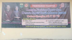 Peserta lomba desain motif batik daerah kearifan lokal Kabupaten Muaro Jambi yang dilaksanakan Dekranasda Kabupaten Muaro Jambi pimpinan Ketua Dekranasda Kabupaten Muaro Jambi saat ini, yaitu Faradillah Zahara Bachyuni,SH dalam rangka memeriahkan rangkaian puncak peringatan HUT Kemerdekaan RI ke-78 tahun 2023, juga sekaligus menggelar lomba fashion show diikuti seluruh pejabat setingkat eselon II (kepala dinas, kepala badan/kepala instansi terkait dan kabag), kepala Organisasi Perangkat Daerah (OPD) di lingkungan Sekretariat Daerah Pemerintah Kabupaten Muaro Jambi, semua camat se-Kabupaten Muaro Jambi, seluruh Lurah dan Kepala Desa (Kades) se-Kabupaten Muaro Jambi. (Afrizal)