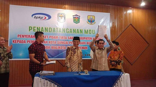 Penyerahan aset PDAM ini, diawali dengan penandatangan MoU antara Pemkab Kerinci dengan Pemkot Sungai Penuh, jumat (9/2) bertempat di gedung BPKP Jambi, disaksikan Kepala BPKP Perwakilan Jambi, Wakil Gubernur diwakili Sekda, Ketua DPRD Kota Sungai Penuh dan Kabupaten Kerinci.