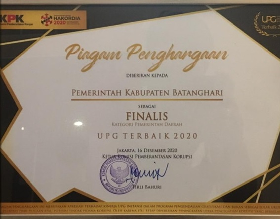 BATANG HARI (WARTANEWS.CO) – Seperti diketahui sebelumnya, Pemerintah Kabupaten Batang Hari, masuk 5 (lima) besar finalis penghargaan Unit Pengendalian Gratifikasi (UPG) Terbaik Tahun 2020 yang diselenggarakan oleh Komisi Pemberantasan Korupsi Republik Indonesia (KPK RI).