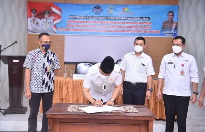 Bantuan berupa 1,5 ton beras dan 15 unit mesin jait lengkap diterima langsung Wali Kota Jambi Dr.H.Syarif Fasha, bertempat di Aula Dinas Sosial Kota Jambi, Rabu (29/09).