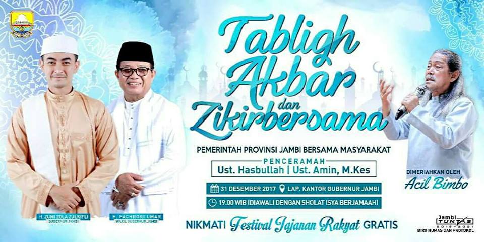Gubernur Jambi H Zumi Zola S.TP MA mengajak seluruh elemen masyarakat untuk dapat hadir dan turut serta bersama keluarga pada malam pergantian tahun untuk menghadiri acara Tabligh Akbar dan Zikir bersama.
