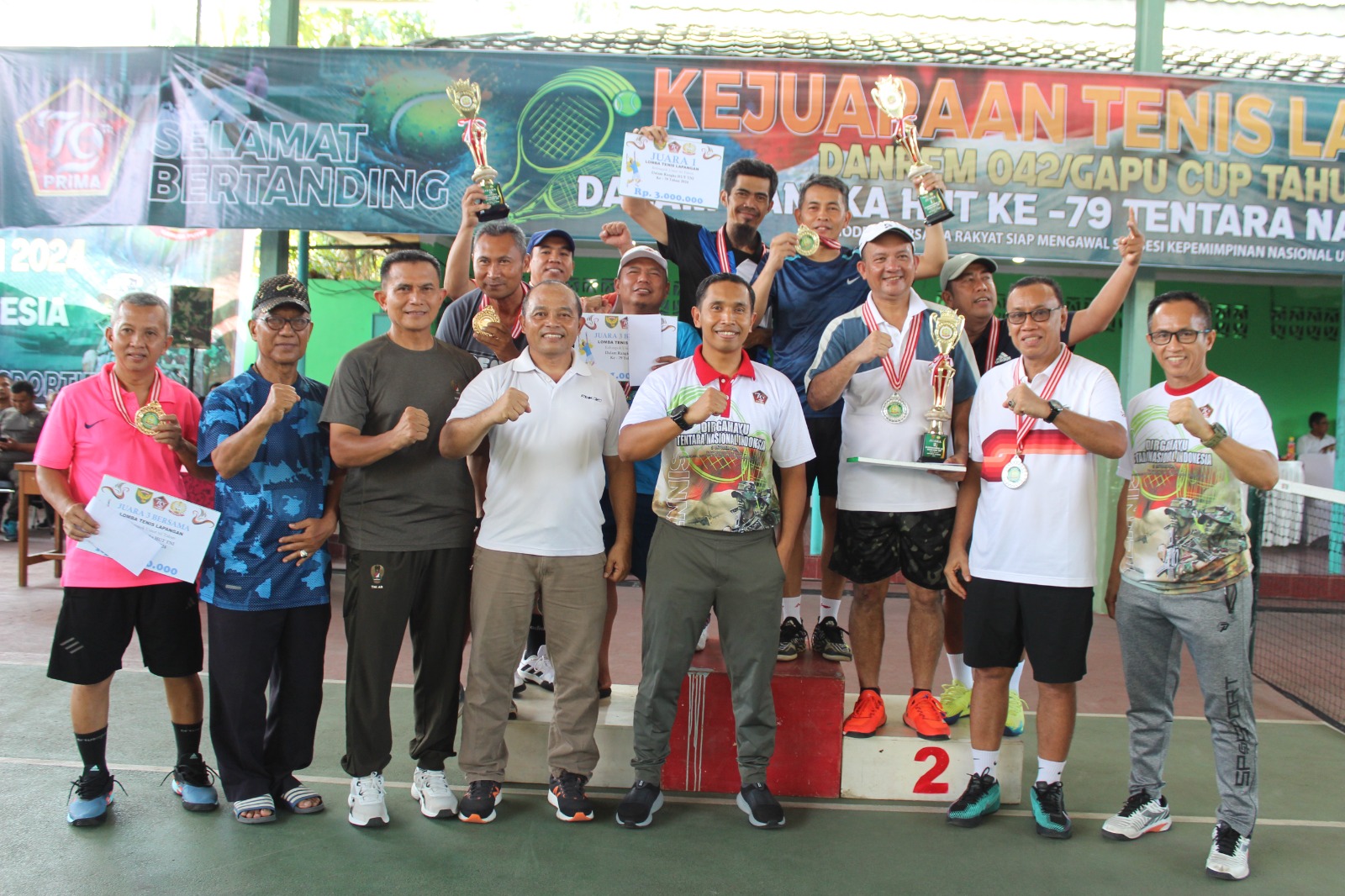 “Alhamdulillah, kejuaraan Tenis Lapangan Danrem Cup 2024 dalam rangka HUT ke-79 TNI telah berlangsung dengan baik. Keberhasilan ini tentunya berkat kontribusi dan kerja keras saudara-saudara semua,” ujar Brigjen Rachmad.