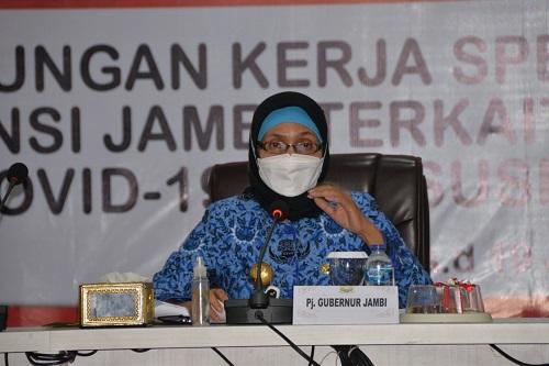 Dalam rapat tersebut, Pj Gubernur menyampaikan bahwa Pemerintah Provinsi Jambi terus berupaya meningkatkan penanggulangan Covid-19 di Provinsi Jambi, dengan melakukan langkah-langkah pencegahan serta menyediakan berbagai fasilitas untuk penanganan pasien terkonfirmasi positif.