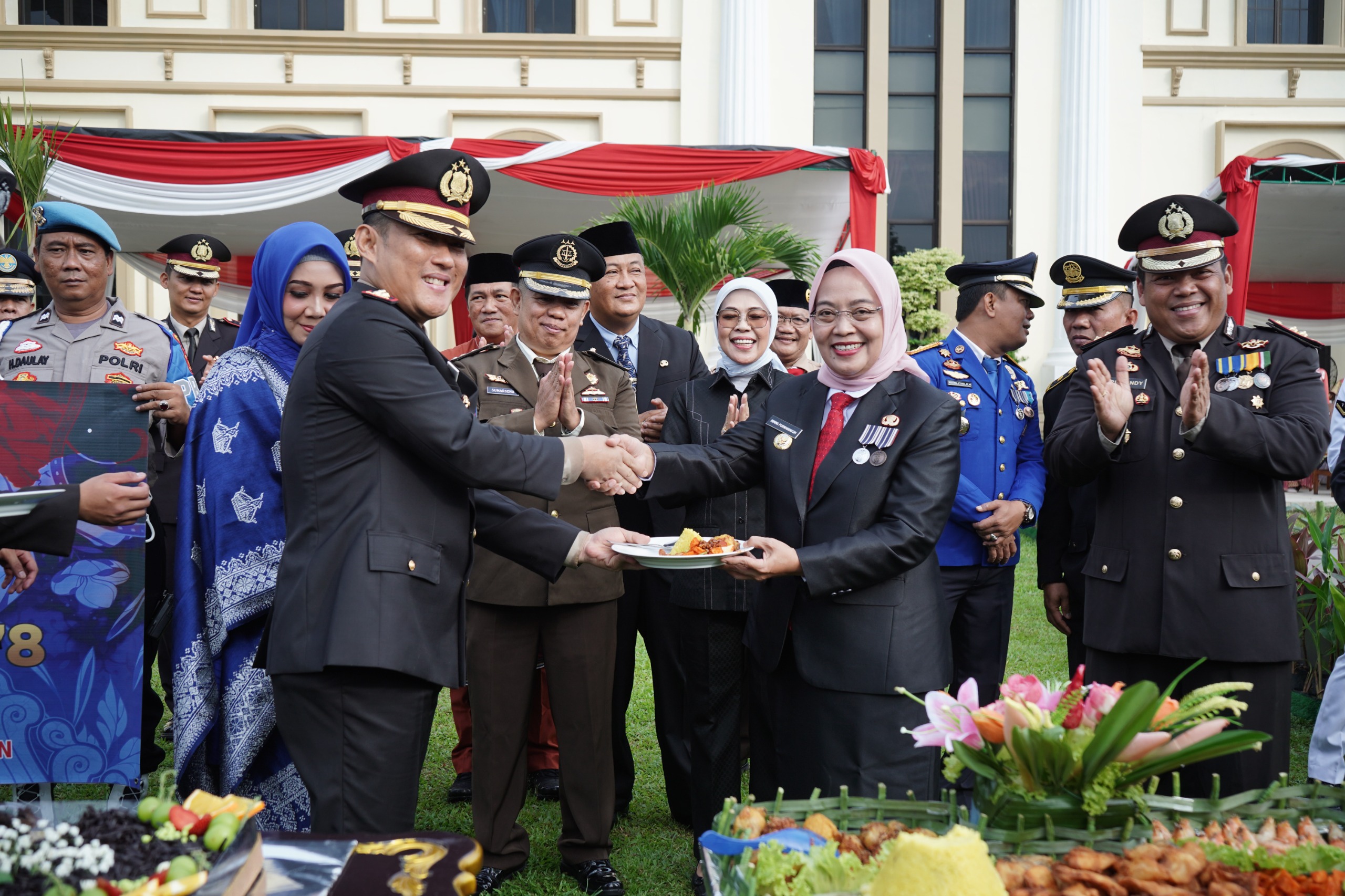 “Kepada segenap jajaran kepolisian khususnya diwilayah hukum Polresta Jambi, izinkan di hari Bhayangkara yang penuh dengan keberkahan ini, saya atas nama Pemerintah Kota Jambi mengucapkan Selamat Ulang Tahun ke-78 Bhayangkara, Sukses dan Jaya Terus Selamanya, “Polri Presisi Mendukung Percepatan Transformasi Ekonomi yang Inklusif dan Berkelanjutan Menuju Indonesia Emas,” tutup Sri.