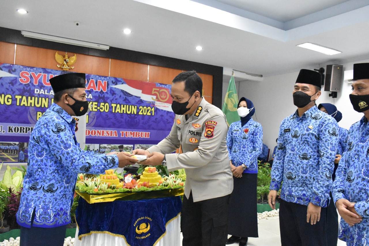Dalam sambutannya, Pembina Harian Korpri Kombes Pol Anton Soedjarwo mengucapkan selamat ulang tahun Korpri, pada segenap PNS di Polda Jambi dan jajaran. Dia meminta untuk tetap membantu kerja-kerja Polda Jambi.