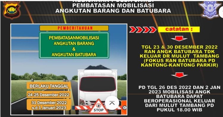 “Untuk pemberlakuan tidak ada mobilitas angkutan truk batubara maupun barang agar tidak mengganggu masyarakat yang akan melaksanakan ibadah akan diberlakukan pada tanggal 24-25 Desember dan 31 Desember 2022 – 1 Januari 2023,” ujarnya.
