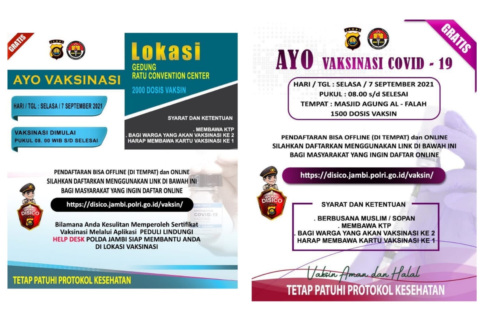 Kapolda Jambi, Irjen Pol A Rachmad Wibowo, S.Ik saat dikonfirmasi Senin (6/9/2021) mengatakan bahwa vaksinasi massal kali ini diselenggarakan di dua sentra vaksinasi yakni di Ratu Convention Center (RCC) Hotel Ratu dan Masjid Agung Al Falah dengan total 3.500 dosis vaksin Covid-19 yang telah disediakan oleh Polda Jambi.