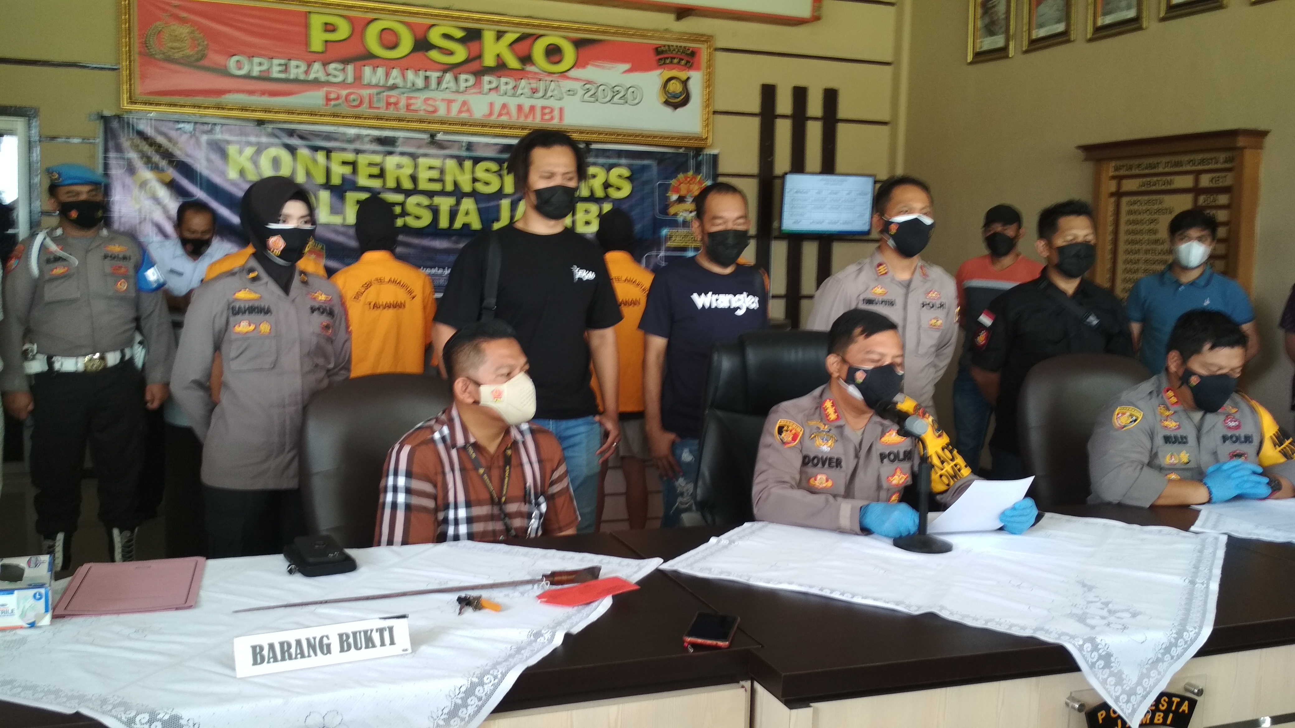 Kapolresta Jambi Kombes Pol Dover Christian SIK MH didampingi Wakapolresta AKBP Ruli Andi Yunianto SIK dan Kasat Reskrim Kompol Handres, Kapolsek Telanai AKP Yumika Putra, dan Paur Subbag Humas Ipda Bahrina.