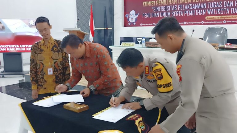 Jambi (WARTANEWS.CO) – Polresta Jambi melaksanakan Penandatanganan Pedoman Kerja Teknis KPU Kota Jambi dalam rangka Sinergitas Pelaksanaan Tugas Dan Fungsi dalam Penyelenggaraan Pemilihan Umum serta pemilihan Wali Kota Jambi dan Wakil Wali Kota Jambi Tahun 2024. Bertempat di Aula Loka Manginti Mapolresta Jambi pada Rabu (06/09/2023).