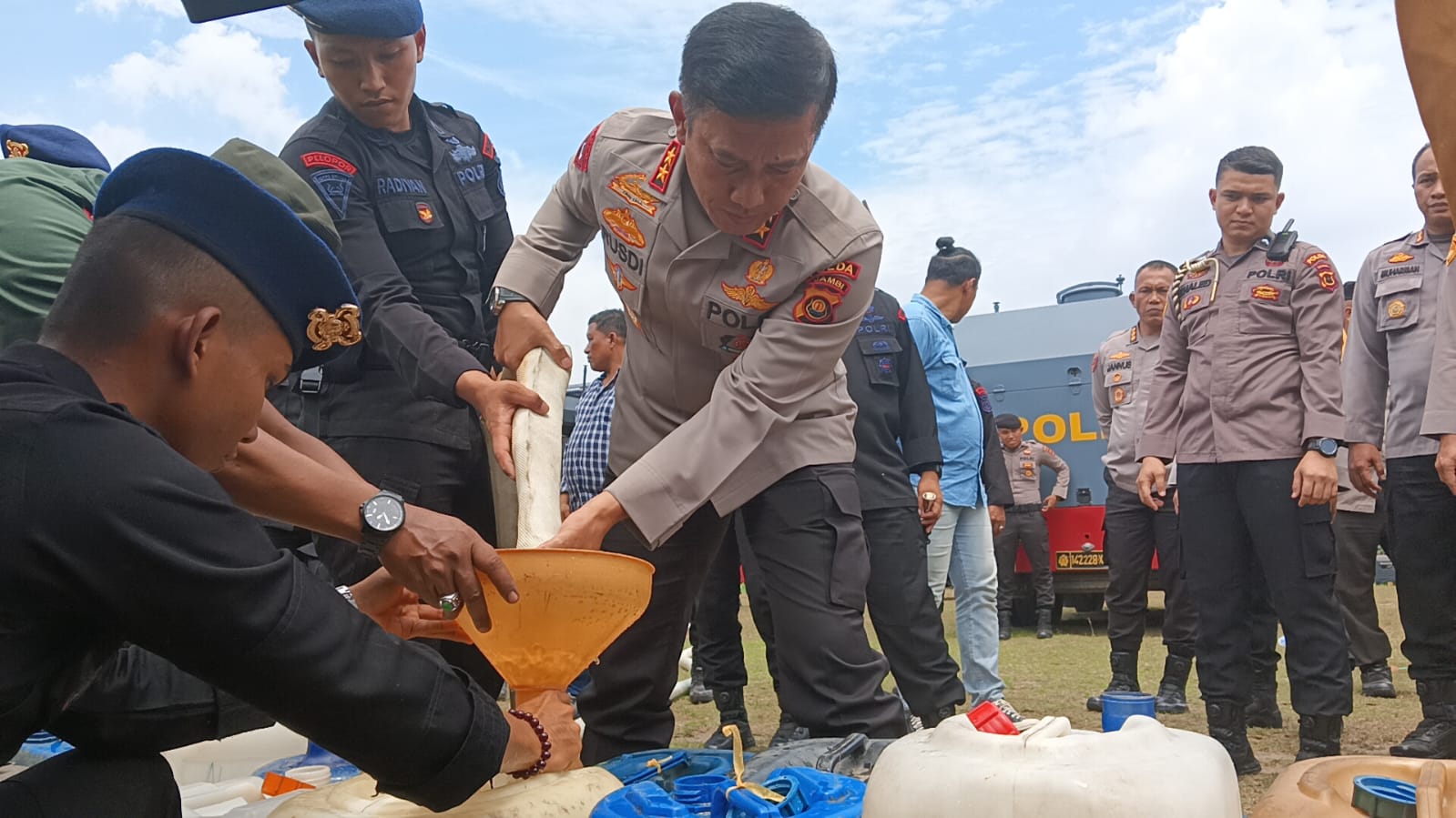 “Diwilayah ini lebih kurang sudah 1 bulan masyarakat sumurnya mulai mengering, oleh karena itu Polda Jambi bekerja sama dengan Pemerintah Daerah di Kecamatan Mestong mendatangi masyarakat dengan membawa beberapa unit kendaraan ukuran besar yang membawa 24.000 liter air bersih yang diperuntukkan bagi masyarakat,” ucap Kapolda.