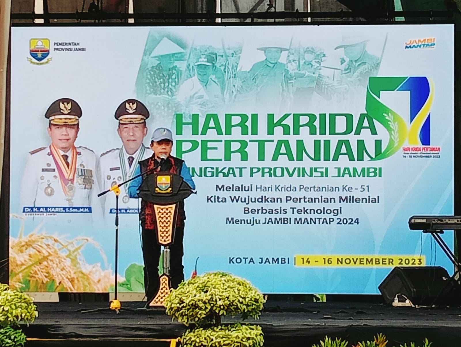 “Pertama-tama pada pagi ini telah berlangsung acara puncak Hari Krida Pertanian Ke-51 Tingkat Provinsi Jambi tahun 2023 yang mana Kota Jambi menjadi tuan rumah. Perlu kita ketahui juga pertumbuhan ekonomi Jambi 4,9 persen itu 1,9 persen nya disumbangkan dari sektor pertanian. Artinya kalau sektor ini kita kuatkan lagi ini sangat produktif,” kata Gubernur Al Haris.